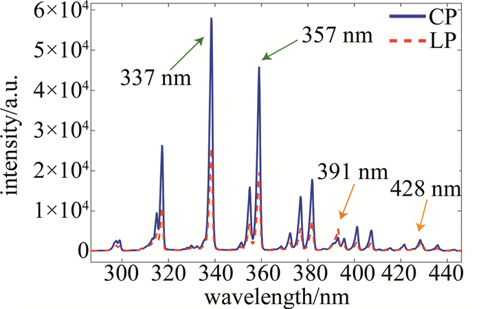 由于多光子電離和隧道電離,飛秒激光成絲過程會伴生大量自由電子以及激發態的離子和分子。氮氣是空氣的主要成分,因此光絲內部產生大量處于激發態的N2+和N2。實驗測量表明,這些激發態的離子和分子在躍遷至低能級時,會產生290 nm~440 nm波長范圍內的熒光。氮熒光的激發機理主要有兩個通道:一個通道是N2+的B2Σu+ → X2Σg+躍遷,如391 nm對應于B2Σu+(ν=0) → X2Σg+(ν′=0)躍遷及428 nm對應于B2Σu+(ν=0) → X2Σg+(ν′=1)的躍遷;另一通道是N2的C3Пu → B3Пg的躍遷,如337 nm對應于C3Пu(ν=0) → B3Пg(ν′=0)躍遷及357 nm對應于C3Пu(ν=0) → B3Пg(ν′=1)躍遷,其中,ν代表電子態的上振動能級,ν′代表電子態的下振動能級。控制入射激光的單脈沖能量為2.0 mJ, 圖 2為在光絲中間位置測量得到的熒光光譜。其中藍色實線和紅色虛線分別表示入射激光為圓偏振態和線偏振態時的熒光光譜。由圖 2可知,337 nm處的N2熒光信號在圓偏振光下的強度比線偏振態下強,391 nm處的N2+熒光信號強度則在線偏振態下較強。圖中, LP表示線偏振(linearly polarized), CP表示圓偏振(circularly pola-rized)。