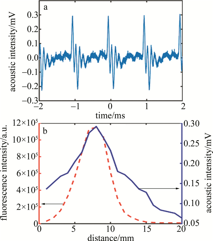 a—acoustic signal b—intensity of fluorescence signal and acoustic signal & propagation distance