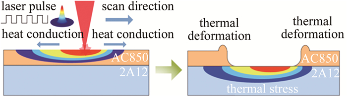 熱應力耦合分析可以反映熱溫度場和應力場的相互影響過程,根據求解步驟的不同, 分為直接求解法和間接求解法。直接求解法是利用包含溫度以及位移自由度的耦合單元,經過一次求解計算同時得到熱分析和結構應力分析結果。間接求解法則需要分步進行,首先通過熱分析計算出模型的節點溫度,將求解的節點溫度作為體載荷施加到結構應力分析中,求解出節點應力。由于直接求解法的平衡狀態需要同時滿足多個準則,復雜的約束條件使得節點自由度較多,并且矩陣方程繁雜,求解效率低。在鋁合金化銑保護膠激光刻型熱應力耦合分析中,相較于結構響應,熱分析的溫度對結構分析時應力應變的影響更為顯著,因此本文中選擇效率較高的間接求解法來實現對鋁合金化銑保護膠激光刻型的熱應力耦合分析。脈沖激光的刻蝕原理如圖 1所示,采用移動高斯熱源模擬長脈沖激光與目標材料的相互作用過程。
