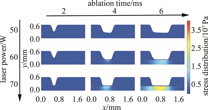 縱向觀察發現,燒蝕時間恒定,燒蝕深度隨著激光功率的增大逐漸增大,同時,燒蝕區域底部對應的保護膠與鋁合金的結合界面處出現了應力集中現象,而應力集中點也隨著激光功率的增大而顯著增多;其中燒蝕時間為4 ms6 ms,激光功率為60 W70 W時,保護膠與鋁合金的結合界面處開始出現應力集中現象,且應力集中區隨著激光掃描路徑延伸逐漸擴大,應力至高點出現在掃描區域的中心位置,且對鋁合金基體材料產生了應力影響。橫向觀察發現,激光功率為50 W時,整個燒蝕過程中沒有出現特別明顯的應力集中區,這是因為激光功率較小時,保護膠材料不能被完全燒蝕,所以保護膠與鋁合金的結合界面處并未產生明顯應力;同燒蝕深度的變化規律,其應力影響區域面積與應力數值也隨著激光功率的增大而增大。仿真計算結果表明:激光功率越大,燒蝕深度越深;激光焦點距保護膠與鋁合金的結合界面處越近,界面處產生的應力就越大,由于鋁合金是熱的良導體,較高的傳熱性能使其在激光刻型時,容易產生更大范圍的應力區域與更高的應力值。