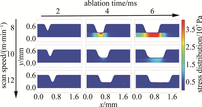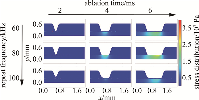 3是以激光掃描速率為變量的仿真結果。分別選取8 m/min, 10 m/min, 12 m/min為參數節點,其余仿真條件如下:激光功率為60 W、重復頻率為100 kHz。燒蝕時間節點選擇與圖例設置同圖 2。橫向觀察發現,較10 m/min, 12 m/min的仿真結果,激光掃描速率為8 m/min時,其燒蝕深度較深,且整個燒蝕過程中產生的應力區域較大、應力值較高,而燒蝕深度、應力區域和應力極值均與掃描速率呈負相關。因為掃描速率的增大會造成激光燒蝕過程中脈沖重疊率的減小,從而降低了激光加工過程中的熱效應累積,同時也減少了熱應力的集中現象。