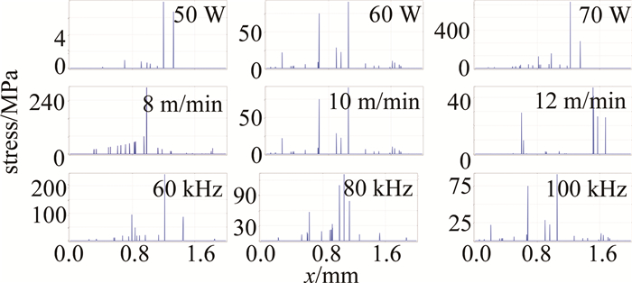 5展示了分別以激光功率(1)、掃描速率(2)、重復頻率(3)為變量,選取燒蝕時間節點為6 ms時,保護膠與鋁合金的結合界面處的應力數值。通過圖 5可以更清晰地看到燒蝕過程中應力極值與加工參數的聯系。觀察發現,應力極值與激光功率呈正相關,與掃描速率呈負相關,與重復頻率呈負相關,其中脈沖激光的掃描功率對應力極值的影響較為顯著。