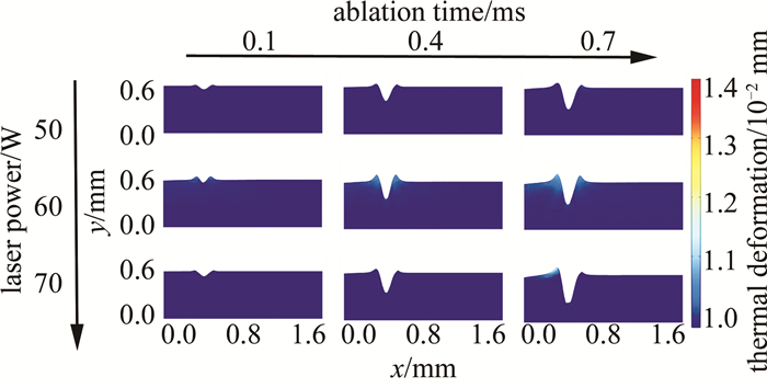 6為不同激光功率對保護膠刻型形貌的影響示意圖。以激光功率為變量,分別選取50 W, 60 W, 70 W為參數節點,根據激光燒蝕時間選擇3個時間節點分別為0.1 ms, 0.4 ms, 0.7 ms。在9個仿真結果中,材料因熱應力而產生的位移通過顏色圖例顯示,至高為1.4×10-2 mm,低為0.98×10-2 mm