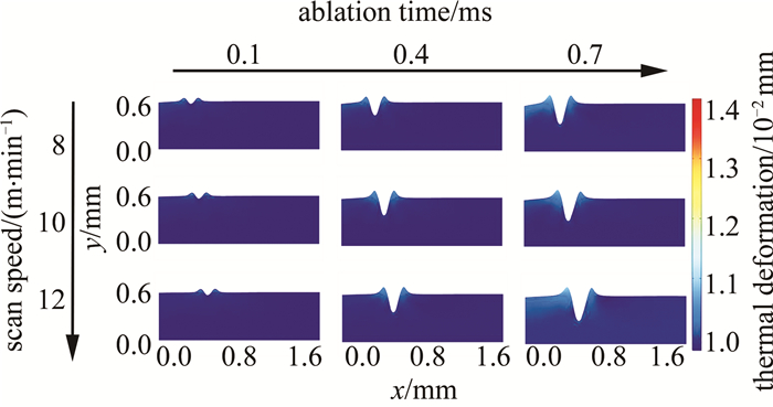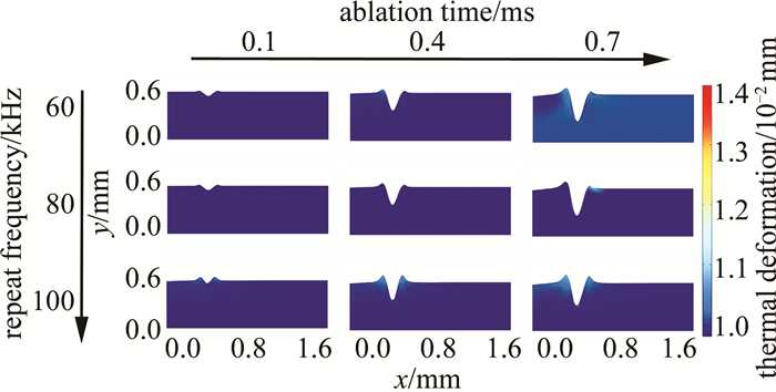 8是以重復頻率為變量的仿真結果。分別選取60 kHz80 kHz100 kHz為參數節點, 其余仿真條件如下:激光功率為60 W、掃描速率為10 m/min。燒蝕時間節點選擇與圖例設置同圖 6。觀察圖 8發現,掃描時間恒定時,重復頻率以選取的參數節點變化; 重復頻率為60 kHz80 kHz時,切口形貌、燒蝕深度無明顯變化,當重復頻率達到100 kHz時,形貌變化較明顯,且切口處產生了較大的熱變形現象。