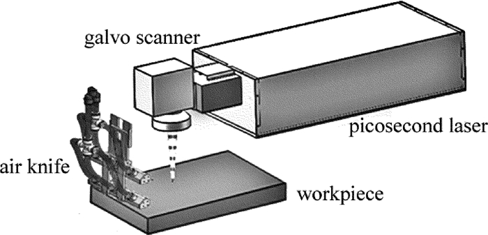 實驗中采用的切割系統如圖 1所示。系統采用EdgeWavePX200-2-GM型皮秒激光器,通過3維掃描振鏡實現z方向動態聚焦,使用空氣作為輔助氣體,并通過氣刀作用于工件表面,氣體壓力為0.8MPa,實驗采用超景深3維顯微鏡觀測掃描深度和熱影響區。