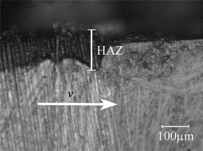 在激光功率為60W、重復頻率為0.4MHz、掃描速率為1m/s時,CFRP表面熱影響區如圖 4所示。從圖中可以看出,CFRP表層纖維的排布方式對熱影區有顯著影響,當掃描方向與表層纖維排布方向垂直時,熱影響區達70μm;當掃描方向與纖維排布方向一致時,材料表面幾乎沒有熱影區。主要是因為碳纖維的熱傳導率遠遠大于環氧樹脂的熱傳導率,未能達到CFRP燒蝕閾值處的脈沖能量沿著碳纖維方向傳播,所以當掃描方向與表層纖維排布方向一致時,沿著掃描方向傳播的能量與下一個脈沖能量共同用于去除CFRP材料,掃描深度也更大,對切縫兩側造成熱影響區較小;而當掃描方向與表層纖維排布方向垂直時,能量沿著掃描垂直方向傳播,切縫兩側熱量累積,對CFRP造成熱損傷,導致嚴重的熱影響區。