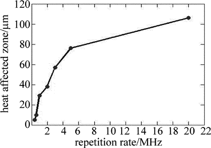 圖 6是平均功率為60W、掃描速率為10m/s時,重復頻率與熱影響區的關系。在圖 6中,重復頻率為0.4MHz~5MHz時熱影響區與重復頻率幾乎成正比關系,隨著重復頻率的繼續增加,熱影響區增大并趨于平穩。主要是因為在平均功率、掃描速率不變時,隨著頻率增加,單脈沖能量減少,達到燒蝕閾值的能量也減少,所以脈沖能量用于CFRP的去除效率更低,使得熱損傷增大;另外,隨著頻率的增加,相鄰脈沖的時間越短,積累的熱量也越多,使得熱損傷相應的增加,從而熱影響區增大。