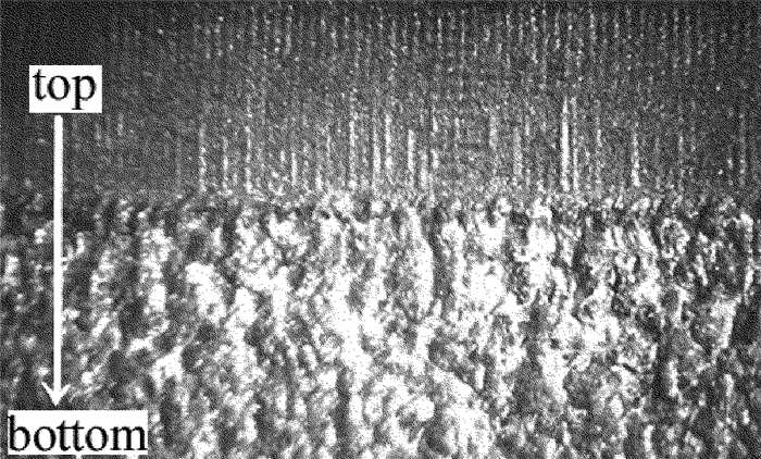 7為不同頻率下縫寬和錐度的變化曲線。其中激光功率20W,切割速率30mm/min,脈沖頻率分別為30Hz, 40Hz, 50Hz, 60Hz。從圖中看出,激光脈沖頻率對切縫寬度影響大。隨著頻率的增大,縫寬顯著減小,同時切割錐度也隨之減小。脈沖頻率的大小決定著激光光斑的重疊程度,圖 8PCBN激光切割、掰片、簡單去熔渣后斷面形貌圖。上層為PCBN,下層為硬質合金。圖中能明顯看出切割后的條紋形狀。根據單脈沖激光能量E與平均輸出功率Pave和脈沖頻率f的關系式E=Pave/f可知,隨著脈沖頻率的增加,單脈沖能量減小,光斑重疊度增大,這對表面切割質量的提高和裂紋的減少起著重要作用。